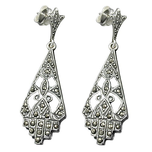 Sieht aus wie Antik-Schmuck, ist aber keiner: Hochwertig gearbeiter Ohrhänger Ohrstecker in Sterling Silber 925 mit kleinen geschliffenen Steinen aus Markasit/Pyrit/Feuerstein ähnlich Jugendstil-Design - insgesamt 43mm lang und 14mm breit. Die oxydierte Oberfläche bietet einen guten Anlaufschutz. Das dunkel-anthrazitfarbene Ohrpendel passt auch gut zu Gothic-Schmuck.