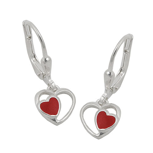Niedliche kleine Kinderschmuck Ohrbrisur Herz im Herz in Sterling Silber 925, Rückseite hohl, gearbeitet in hochwertiger Juwelierqualität. An dem Kinderohrring pendelt ein 8mm großes silberglänzendes Herz, in dem ein kleines rot lackiertes Herz auf dem Rand sitzt. Ohrringe mit Klappbügel sind besonders gut für Kinder geeignet. Der Verschluss hält sicher am Ohr und verhindert das Pieken am Hals. Das rote Herz steht auf der ganzen Welt als Symbol für die Liebe. Diese farbigen Doppelherz-Ohrringe sind ein wunderschönes Geschenk zum Geburtstag, Schuleinführung oder einfach mal zwischendurch.
